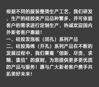 我公司生產(chǎn)的硅膠海綿(開(kāi)孔)系列產(chǎn)品具有耐高溫、透氣性好、耐壓性強(qiáng)等優(yōu)點(diǎn),是西服及高檔服裝整燙生產(chǎn)的必備產(chǎn)品。硅膠發(fā)泡板(閉孔)系列產(chǎn)品具有發(fā)泡均勻,耐高溫、耐壓性能好,其中新研制開(kāi)發(fā)的針孔浮點(diǎn)硅膠發(fā)泡板攻克了一般產(chǎn)品的浮點(diǎn)不飽滿(mǎn)的技術(shù)難題,一般產(chǎn)品的浮點(diǎn)不飽滿(mǎn),容易擋住透氣孔,造成吸風(fēng)效果不良。我司的產(chǎn)品具有更好的透氣性和回彈性,以及更長(zhǎng)時(shí)間的試用壽命。